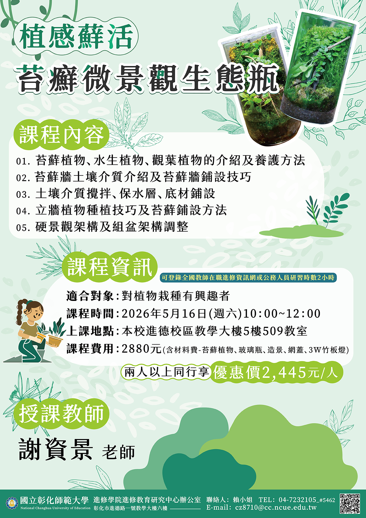 課程費用:2,880元(含材料費-苔蘚植物、玻璃瓶、造景、網蓋、3W竹板燈) ,兩人以上同行或於115年03月31日前早鳥報名享優惠價每人2,445元。 |