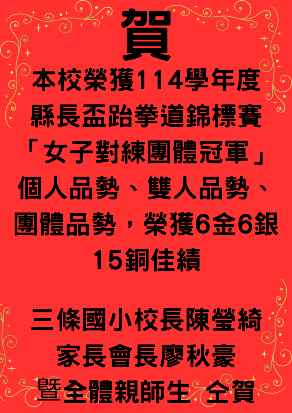 本校參加114學年度縣長盃跆拳道錦標賽榮獲佳績,獎牌數:6金6銀15銅,獎盃:女子組對練團體第一名
